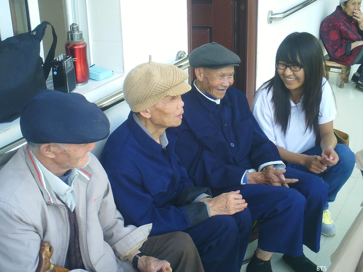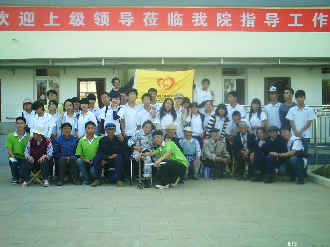 有的在和老人聊天,聊老人们年轻时的经历:有的在陪老人下象棋,展开智力与智力的对决:有的在给老人唱红歌,更有的同学为老人唱黄梅戏女驸马,民乐凤阳花鼓等等。有的老人还激动的唱起了老歌。总之,各位同学都用行动表达了对老人们的敬爱和祝福。在四点半左右,我们结束了今天的行程。有一位老奶奶兴奋的跳起了舞蹈,挥手同我们说再见。最后所有志愿者和老人及院长合影留念后,每位同学都一一与老人道别,并祝愿老人们身体健康,事事顺心。