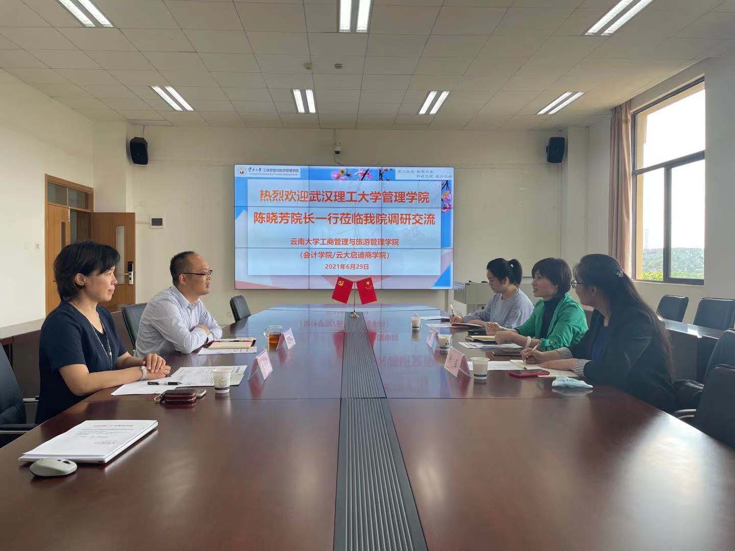6月29日下午,武汉理工大学管理学院陈晓芳院长一行3人到我院进行了调研交流,我院主持工作副院长赵德森、副院长赵书虹在呈贡校区学院楼1411会议室热情接待了陈院长一行。