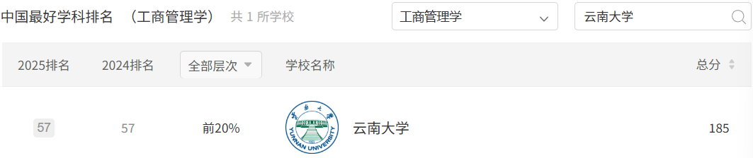 在此次排名中,云南大学工商管理学在154所参评高校中位列57,连续多年稳定在全国前20%层次,继续保持云南省各高校第一位。此次排名结果充分彰显了云南大学在商科教育领域的深厚积淀与区域核心竞争力,为国家经济社会发展培养高层次管理人才提供了重要支撑。