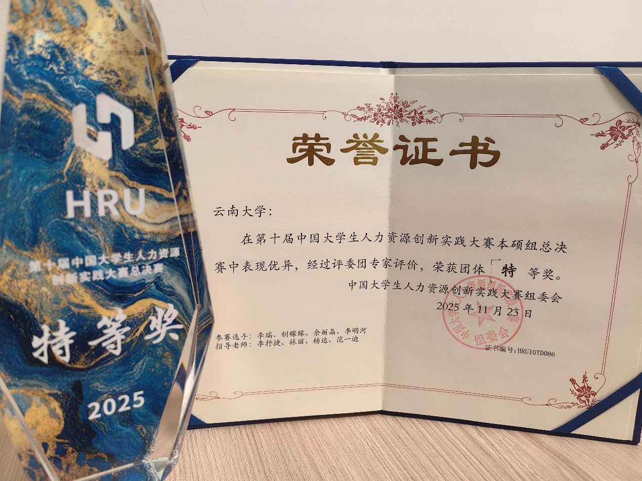 2025年11月21日至23日,第十届中国大学生人力资源创新实践大赛(HRU)总决赛在北京举行,云南大学工商管理与旅游管理学院学生团队发挥出色,在七个竞赛赛道中累计获得特等奖3项、一等奖2项、二等奖4项,并成功摘得大赛最高荣誉——团体特等奖。