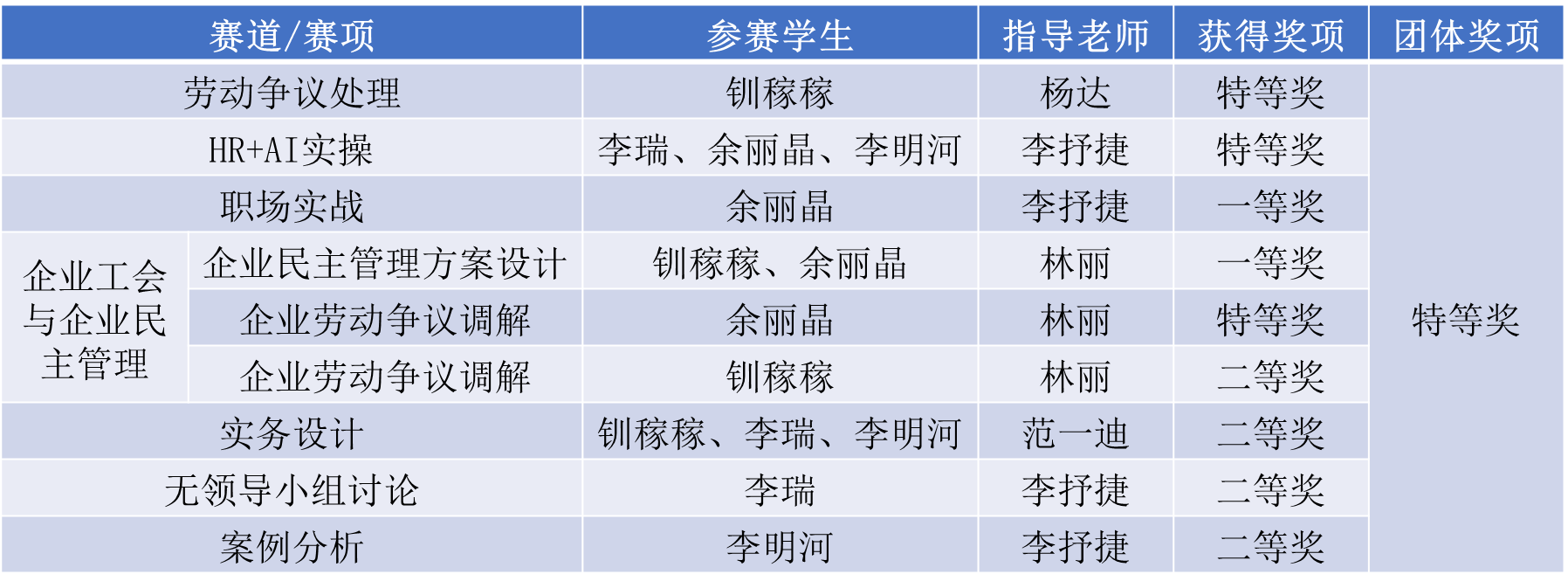 赛事围绕人力资源管理核心模块,设置了职场实战、无领导小组讨论、HR+AI实操、实务设计、案例分析、劳动争议处理、企业工会与企业民主管理等多个竞赛赛道,依托仿真业务场景,系统考察学生的专业知识与实践技能。由我校商旅学院1名硕士研究生和3名本科生组成的本硕团队顶住高强度的竞争压力,协同配合、沉着应战,凭借扎实的专业素养与优秀的综合能力,在七个赛道中取得优异成绩。