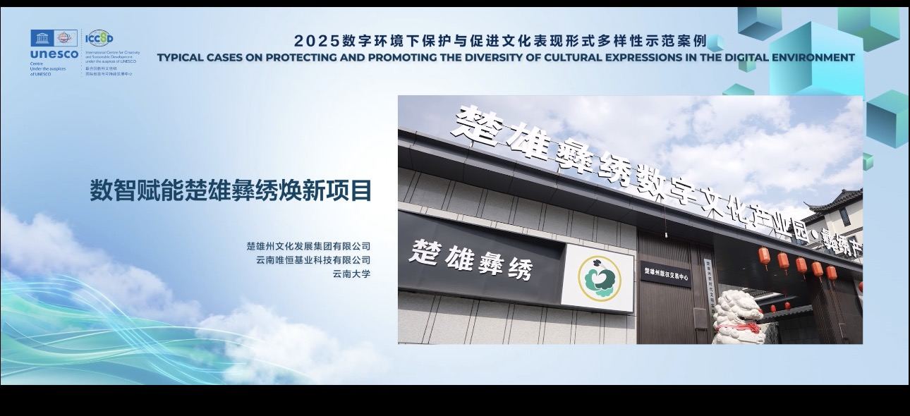 2026年3月27日,2025数字环境下保护与促进文化表现形式多样性示范案例在第五届创意2030国际论坛上正式发布,40个兼具创新性、可持续性与跨文化可复制潜力的示范案例脱颖而出,为数字时代文化多样性保护贡献了一份凝聚全球智慧的“创新答卷”。其中,学院智慧文旅与可持续发展团队深度参与的“数智赋能楚雄彝绣焕新项目”成功入选联合国教科文组织创意中心示范案例。